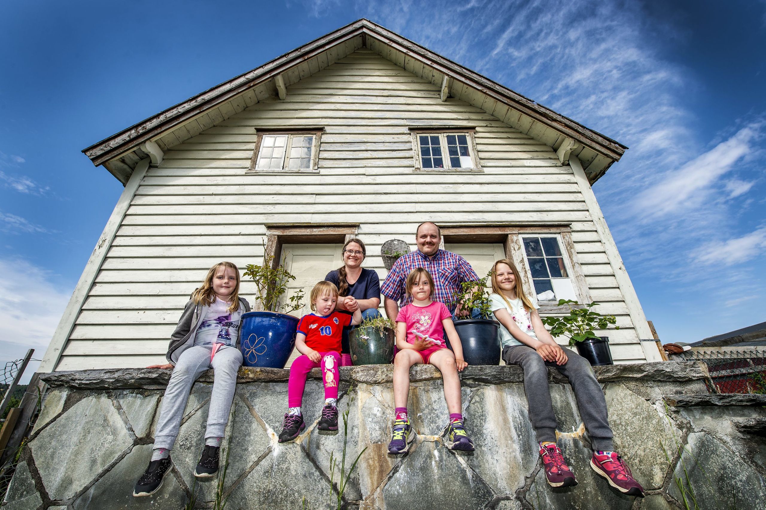 I familien Fjørtoft jobbar dei vaksne på NTNU i Ålesund. I tillegg driv dei garden heime på Giskemo med korn og poteter. Dei fire jentene leikar seg i hagen.