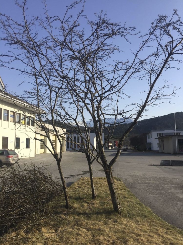 Grøn gerilja: På sørsida av Sjøholt sentrum står slitne næringsbygg. Her har ein grøn gerilja stelt tre som har vore vanskjøtt lenge. Foto: Privat