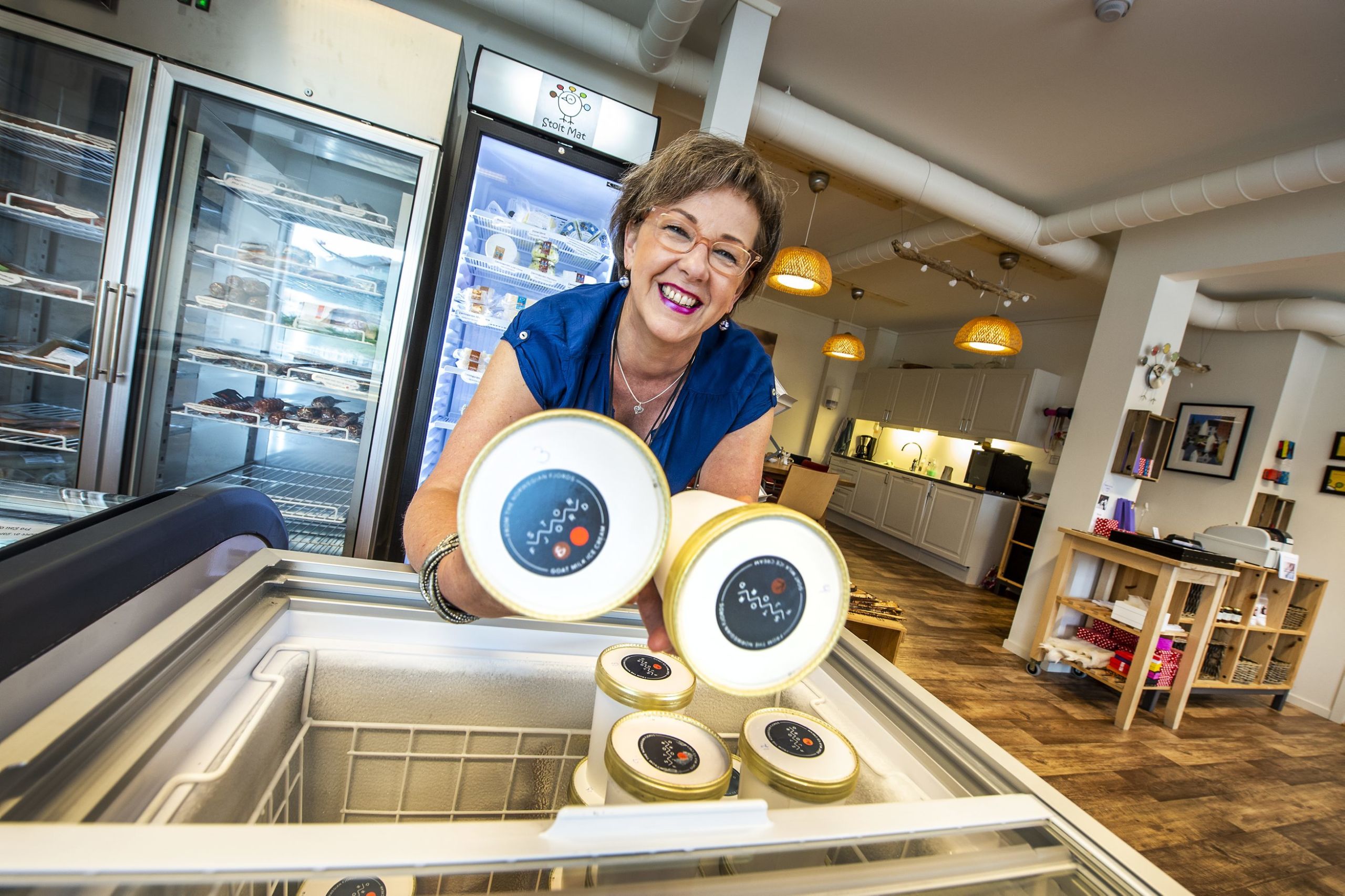Janet Roelofs fram matvarer frå meir enn 50 produsentar i Møre og Romsdal. Det siste nye er Storfjord Iskrem laga av geitemjølk, fortel ho.