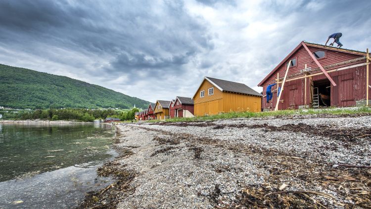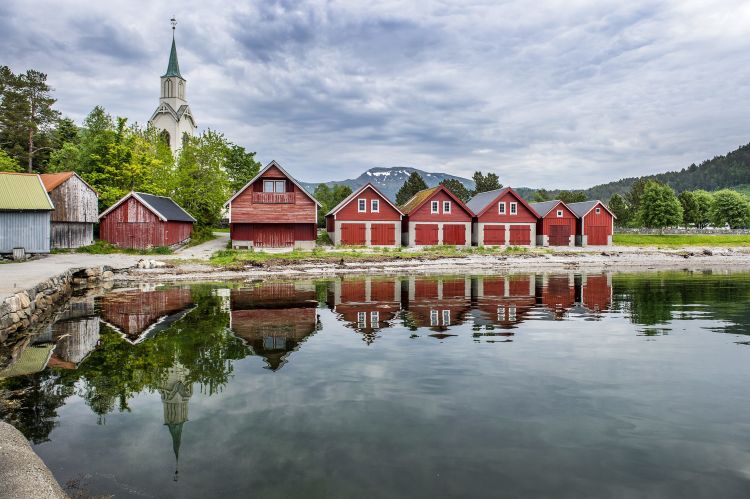 Prestefjøra: Naustrekke på Sjøholt med Ørskog kyrkje bak.