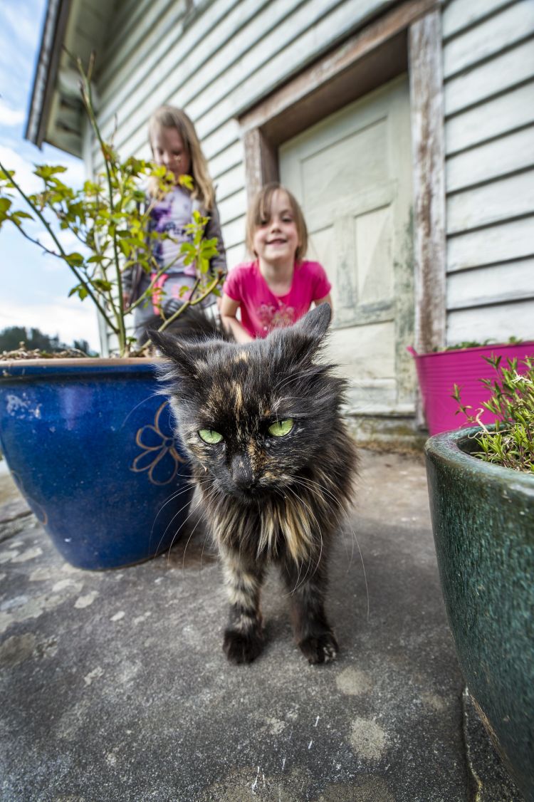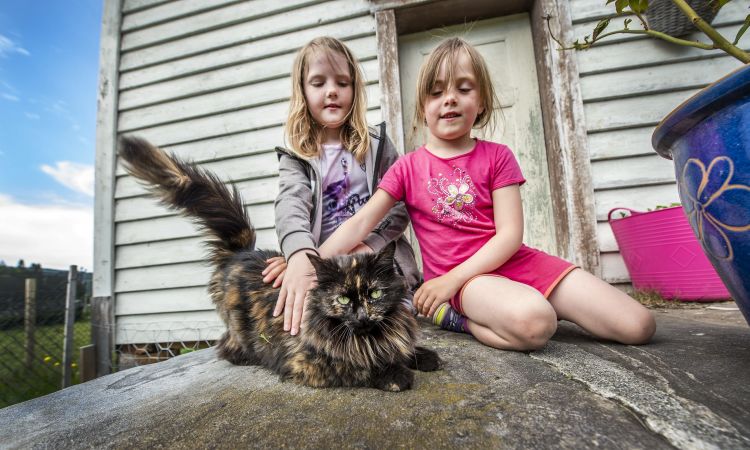 Kattebesøk: Hanne og Sunniva med en besøkende katt.