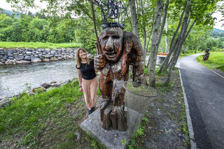 Elvastien: Her er det benkar, bålpanner, ei grindløe og figurar laga av den lokale kunstnaren Jørund Amdam. Runa Klock er guide.